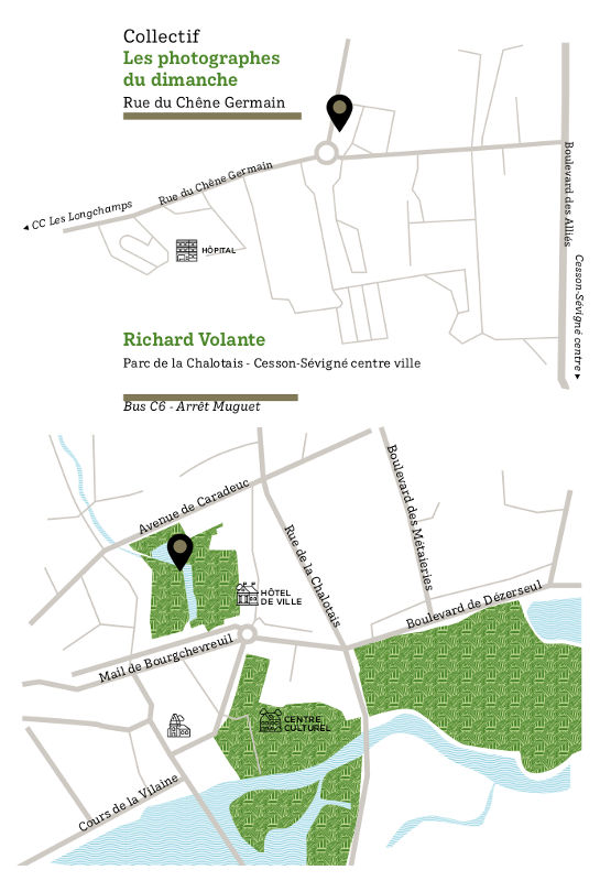 À l’intersection de la rue du Chêne Germain et de la rue de la Touche Lambert, entre les « colonnes », le collectif de photographes du dimanche (Philippe Koci, Gildas Choquer, Vincent Demoulin, Sébastien Lepeigneul, Luc Rabin, tous habitants ou salariés du territoire)  présente son travail, réalisé sous l’œil bienveillant de Richard Volante. À quelques pas de cette installation, une série de photos sont également exposées dans le restaurant interentreprises Le Calydon.