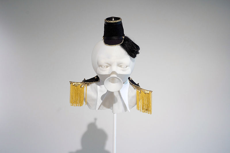 Les portraits de marbre contemporains sont des empreintes 3D de ballons de baudruche recouverts d’un tissu. Un « masque » en surépaisseur prend la place des yeux des fantômes rappelant l’extraordinaire masque de théâtre de Michel-Ange au pied du tombeau des Médicis à Florence. Les bouches sont des trompettes. Les fantômes sont identiques. Chacun est singularisé par des « costumes » rappelant les artifices spécifiques au rôle qu’il « incarne », là encore pied de nez de l’artiste, la carnation n’étant pas la première qualité d’un fantôme.