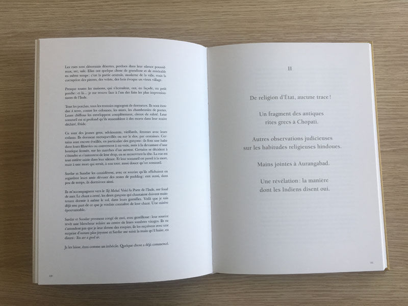 Dans L’odeur de l’Inde, ses images sont mises en regard des mots du grand auteur italien, écrits lors d’un périple avec Alberto Moravia et Elsa Morante. Son texte n’est pas vraiment un récit, mais le fruit de ses errances nocturnes, où la grande misère côtoie la plus étrange des spiritualités, aux confins d’une humanité primitive.